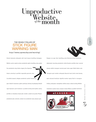 This is one of the regular monthly features in the magazine, the Unproductive Website of the Month. This issue features a website devoted the stick figure warning man. The same principles were used here as in the feature article. A vast amount of white space, extreme leading and a few images to help guide your eye and give you something to look at when reading the article gets too boring. The title of the feature, Unproductive Website of the Month, forms an interesting shape on the page and adds some interest by breaking up the symmetry of the page.