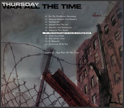 This is the song list page for the website. Each title links to it's lyrics, which pop up in their own window. The title first show up as white text on the gray background. When you mouse over the titles, the white bar appears and the title text turns black, as seen in track 7 above.
